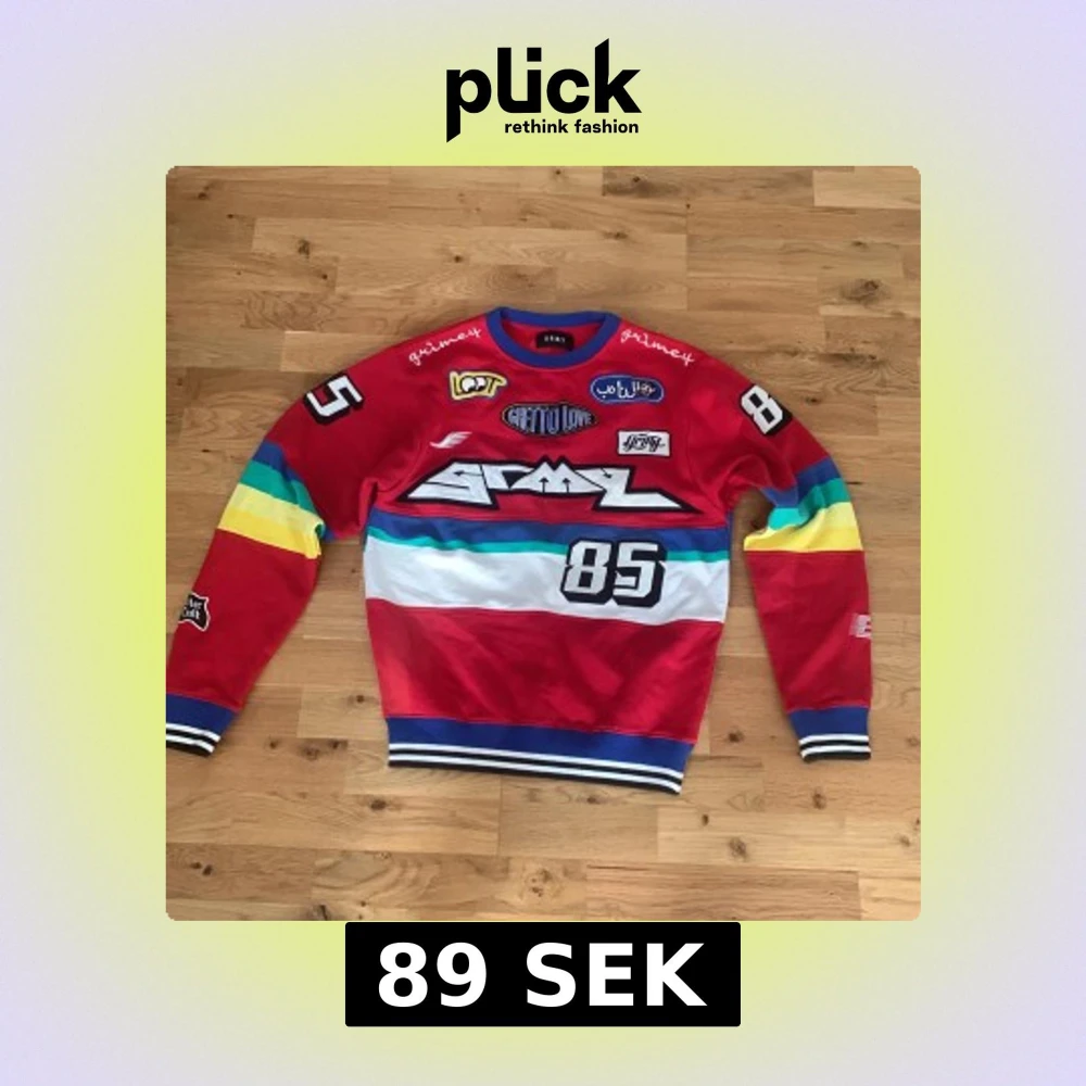 Säljer en röd sweatshirt från GRMY med färgglada ränder på ärmarna och bröstet. Tröjan har flera tryck och patches, bland annat siffran 85 och olika loggor. Ribbstickade muddar i blått och vitt vid ärmslut och nederkant.