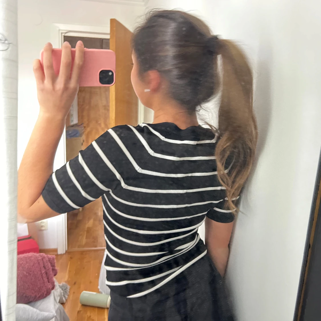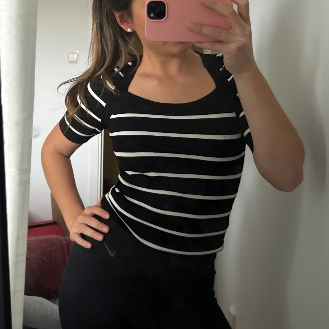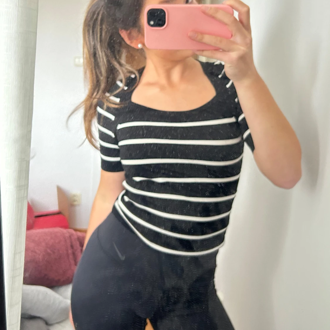 Säljer en svart topp med vita horisontella ränder och rundad halsringning. Toppen har korta ärmar och sitter figurnära..