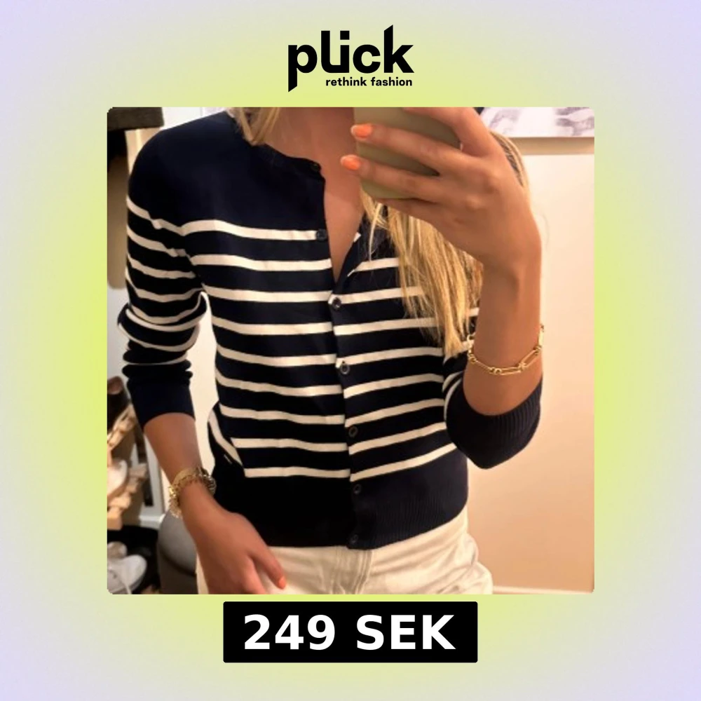 Säljer en marinblå kofta med vita ränder och knäppning framtill. Super skönt material som andas!