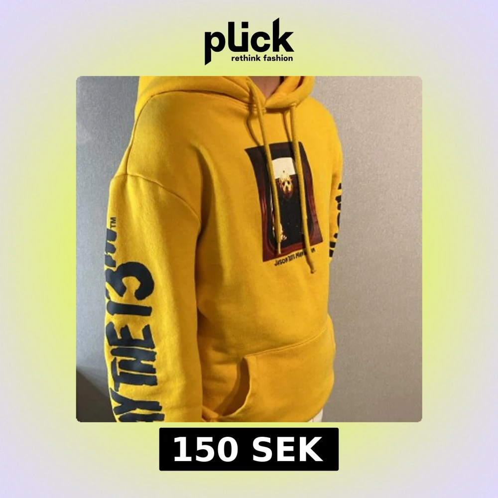 Gul hoodie från Divided (hm) med stor svart text 'Friday the 13th' på båda ärmarna och tryck med Jason från 'Jason Takes Manhattan' på bröstet. Tröjan har huva med snörning och en stor magficka. Använd ett fåtal gånger, Storlek S, väldigt skön och sitter snyggt! Passar både för tjejer och killar!