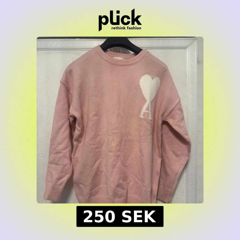 Säljer en söt rosa stickad tröja från Ami med ett stort vitt hjärta på bröstet. Tröjan har en rund halsringning och långa ärmar. Perfekt för en mysig dag.