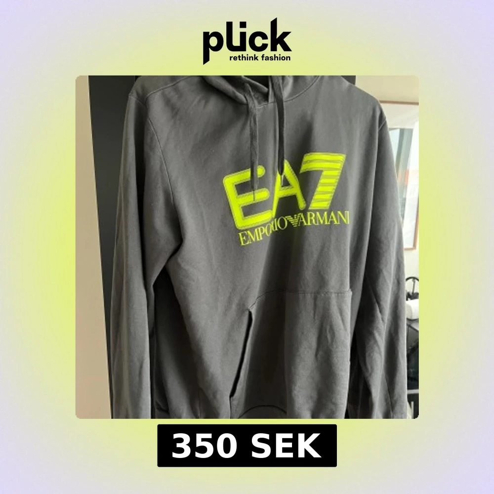 Snygg grå hoodie från Emporio Armani med en iögonfallande gul logga på bröstet. Tröjan har en klassisk huva med dragsko och en praktisk magficka. Perfekt för en avslappnad stil.
