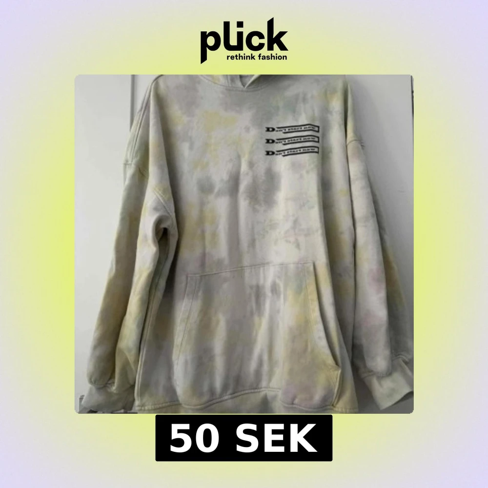 Säljer en oversized hoodie i ljusa tie-dye färger med gult och grått. Tröjan har huva, stor magficka och tryck med texten 'Don't start now' på bröstet. Perfekt för chill dagar och streetstyle.