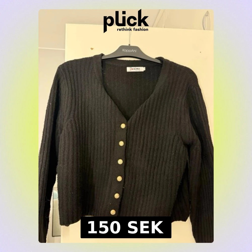 Stilren svart ribbad kofta från J'aime, köpt på Missäy i Göteborg med långa ärmar och guldknappar framtill. Perfekt att matcha med jeans eller kjol. Pris kan diskuteras. Aldrig använt. Tror ny pris va 400. Storleken är S/M men skulle säga att den är S.