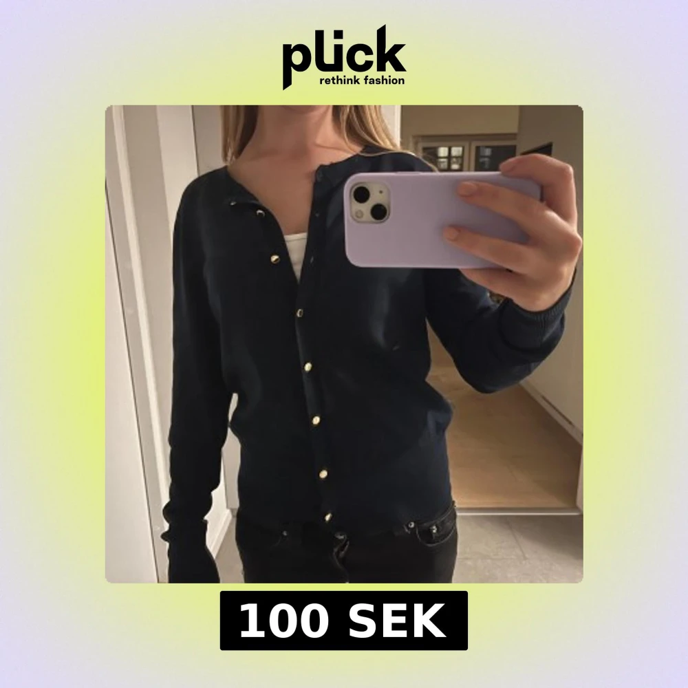 Mörkblå kofta från Holly & Whyte med guldknappar framtill. Klassisk rund halsringning och ribbade muddar vid ärmslut och nederkant. Perfekt att slänga över en topp för en chill look.