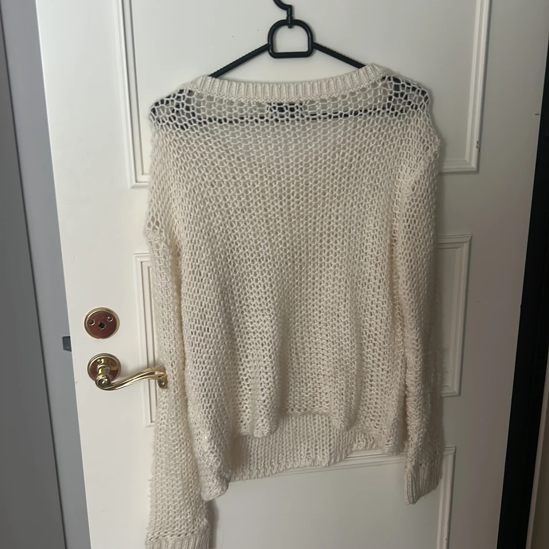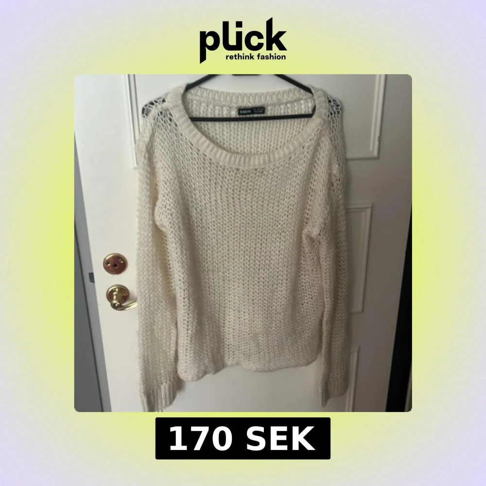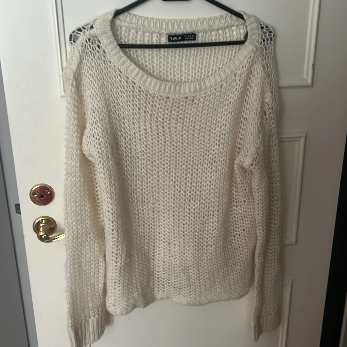 Säljer en vit stickad tröja från SHEIN i storlek S. Tröjan har grovstickat meshmönster, rund hals och långa ärmar. Perfekt för lager-på-lager och chill stil. Materialet är mjukt och luftigt, vilket gör den skön att bära under höst och vår. Använd endast 2 gånger💕