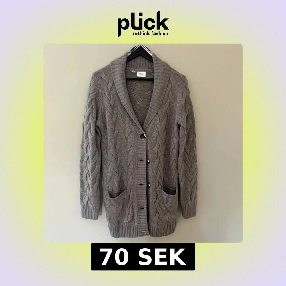 Mysig grå kofta från bpc med grovt flätstickat mönster, djup sjalkrage och stora knappar framtill. Koftan har två praktiska fickor och långa ärmar. Perfekt för lager-på-lager under kyliga dagar.