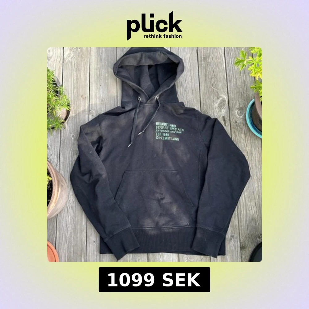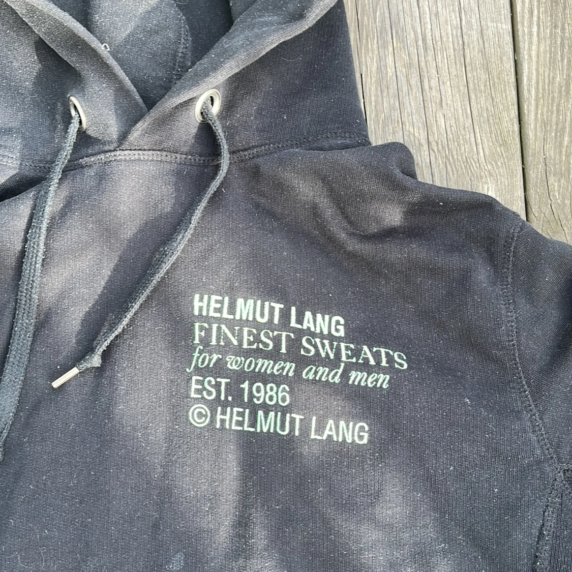 Svart hoodie från Helmut Lang med broderad text på bröstet. Klassisk känguruficka, snörning i huvan och ribbade muddar. Perfekt för en chill och stilren look.
