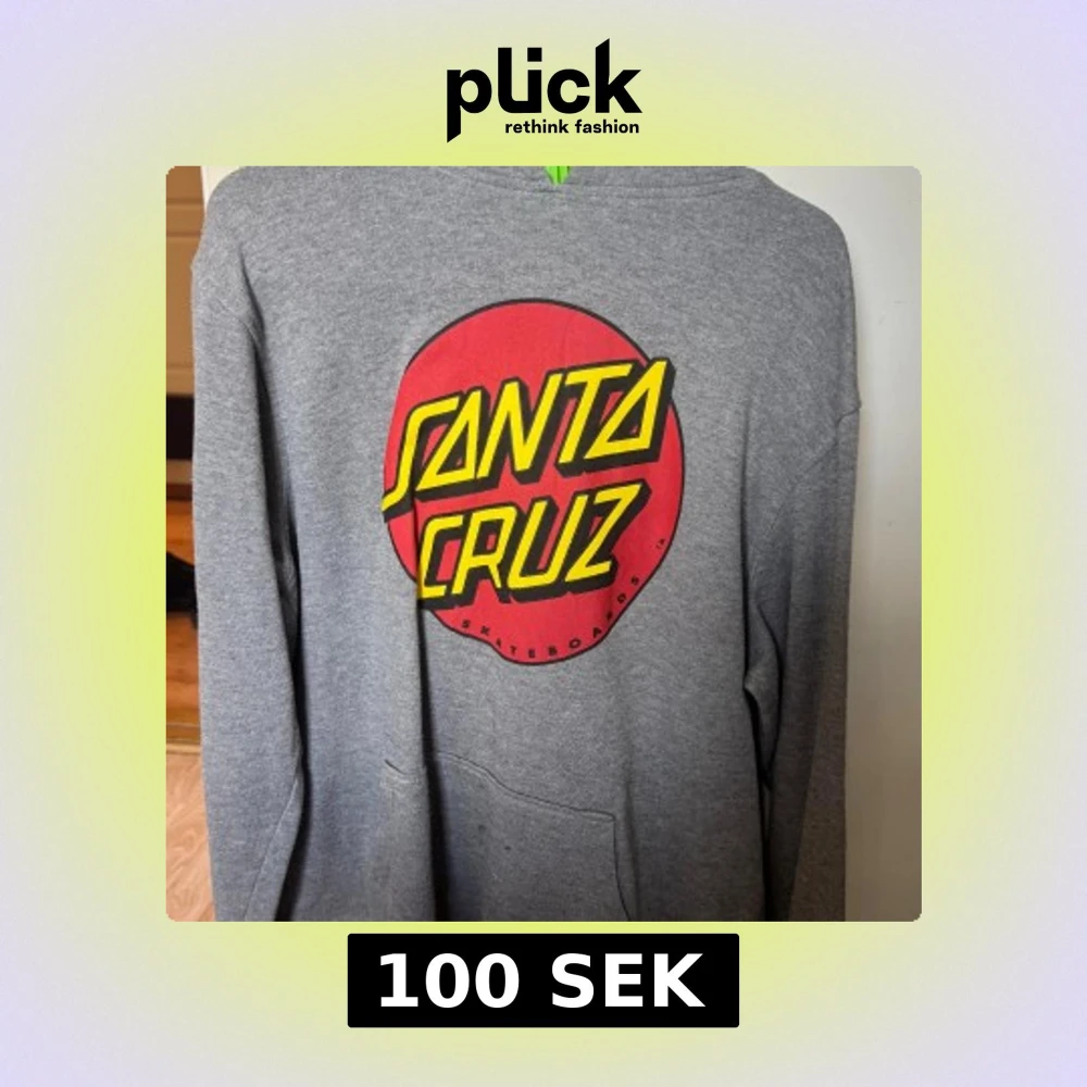 Säljer en grå hoodie från Santa Cruz med ett stort rött och gult tryck på framsidan. Tröjan har en klassisk känguruficka och långa ärmar. Perfekt för en avslappnad stil.