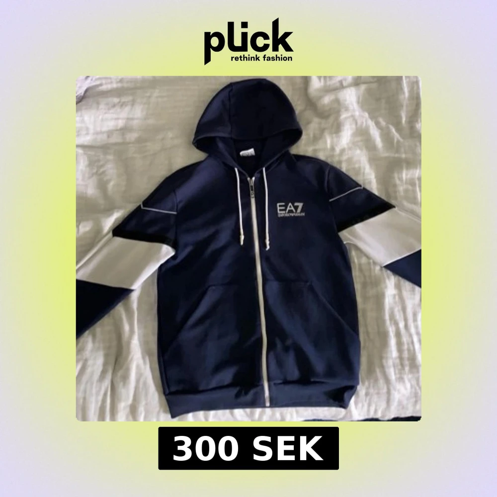 Snygg marinblå hoodie från EA7 Emporio Armani med vita detaljer på ärmarna och vit dragkedja. Tröjan har huva med snörning och två fickor framtill. Perfekt för en sportig och stilren look.