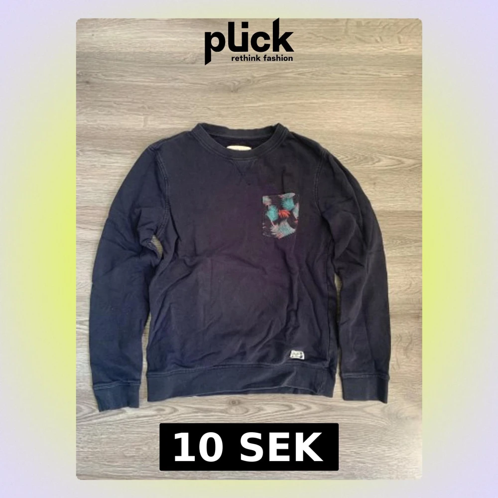 Mörkblå sweatshirt från Pier One i storlek S. Tröjan har en cool bröstficka med färgglatt mönster i blått, grönt och rött. Mjuk insida och klassisk rund hals. Perfekt för dig som gillar stilrena plagg med en twist.