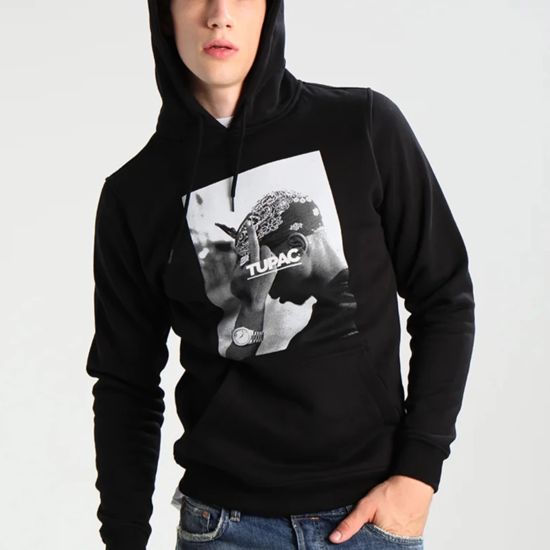 Snygg svart hoodie med ett stort tryck av Tupac på framsidan. Perfekt för dig som vill ha en bekväm och stilren tröja med en ikonisk design. Hoodien har en klassisk passform och en praktisk ficka framtill.