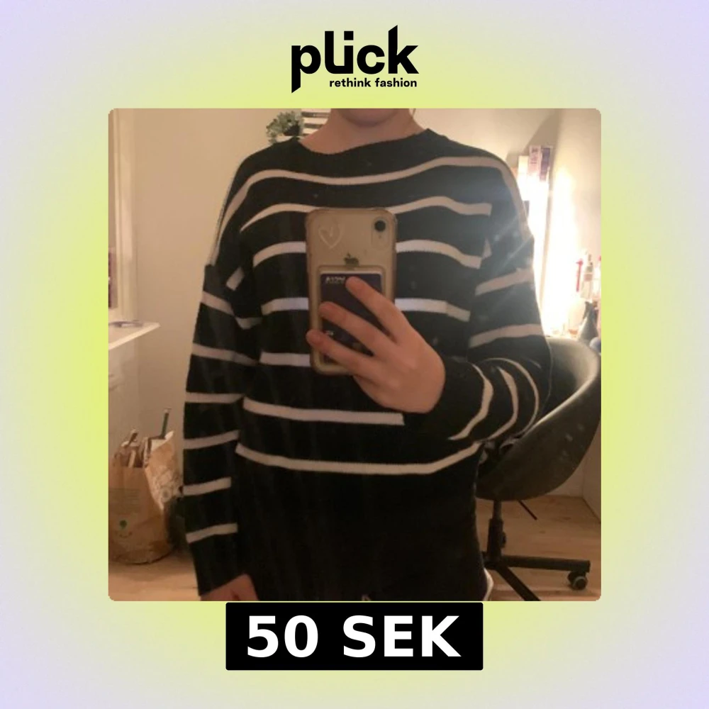 Säljer en svart tröja med vita ränder. Tröjan har långa ärmar och en klassisk rund halsringning. Perfekt för en avslappnad stil.
