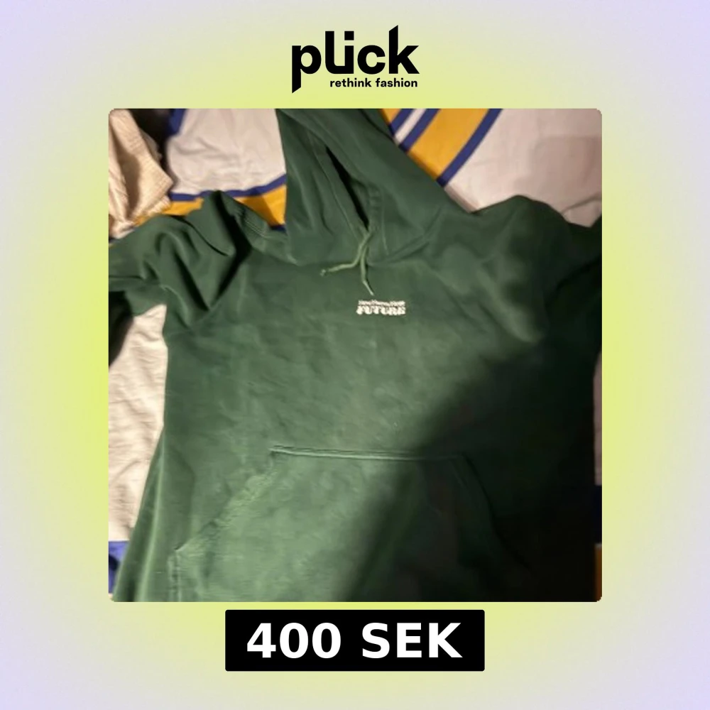 Säljer en mörkgrön hoodie från Future med vit text och grafiskt tryck både fram och bak. Tröjan har huva med snörning och en stor magficka. Perfekt för dig som gillar streetwear och vill ha en chill look.
