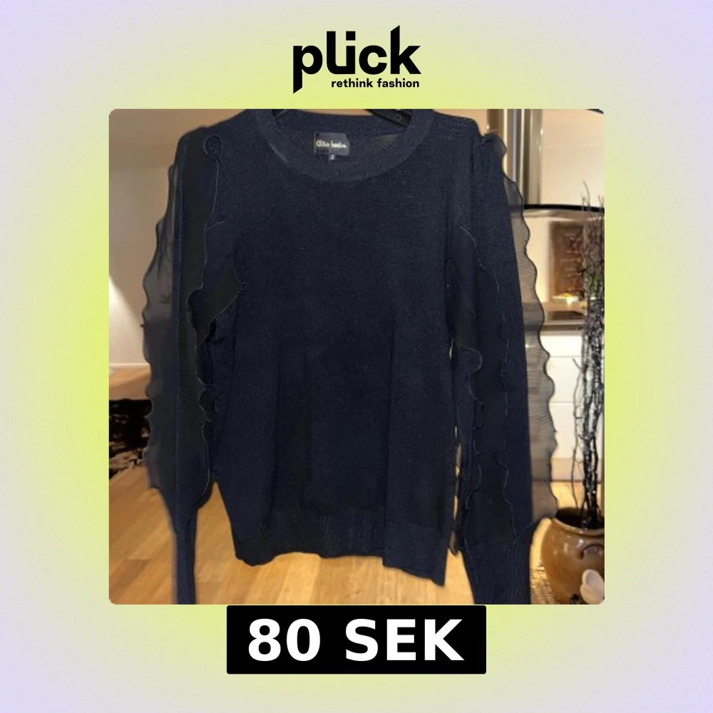 Snygg svart tröja från Rita London med transparenta, vågiga volangdetaljer längs hela ärmarna. Tröjan har rund halsringning och ribbade muddar vid ärmslut och nederkant. Perfekt för dig som vill ha något stilrent men ändå unikt.
