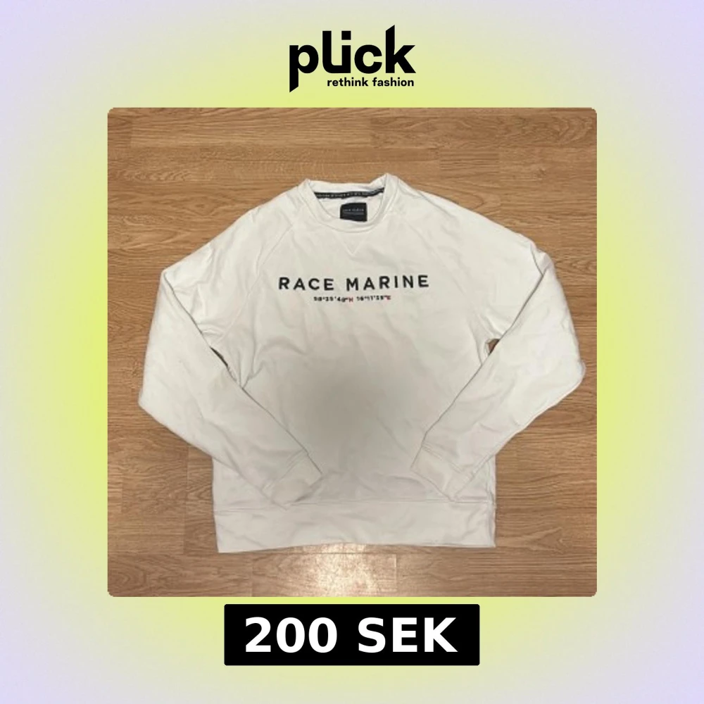 Vit sweatshirt från Race Marine med tryck på bröstet och koordinater. Tröjan har rund hals, långa ärmar och ribbade muddar. Hör av vid intresse!