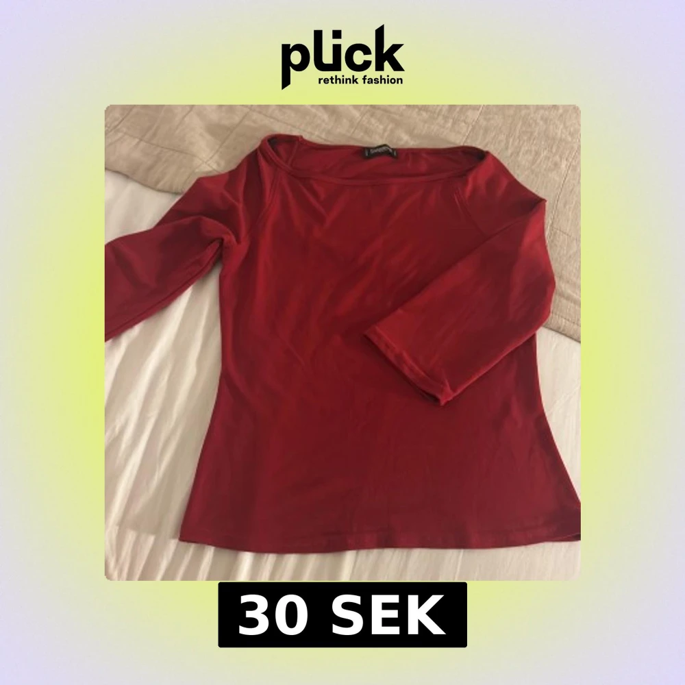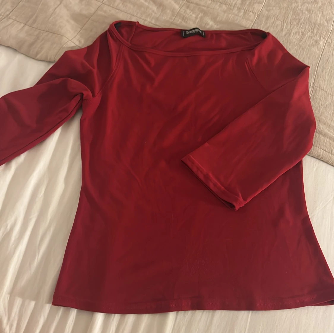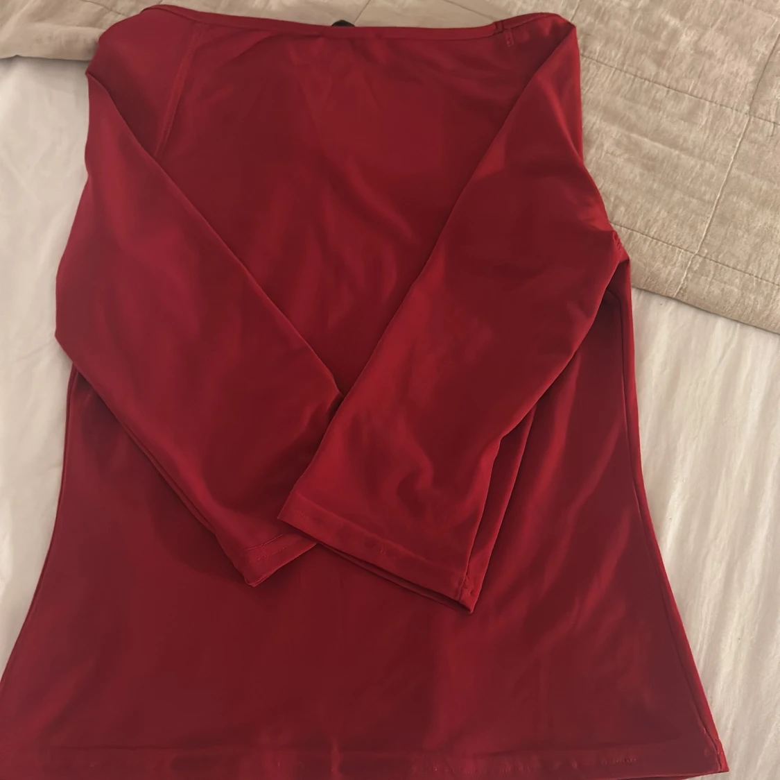 En stilren röd topp med trekvartsärm och rundad halsringning. Modellen är figurnära och enkel, perfekt att matcha med jeans eller kjol. Materialet känns mjukt och stretchigt, vilket gör den bekväm att bära hela dagen.