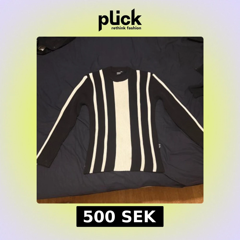 Säljer en ribbstickad tröja från Dolce & Gabbana med svart och vit vertikalrandigt mönster. Tröjan har lång ärm, rund halsringning och en tight passform. Perfekt för dig som gillar en stilren och edgy look.