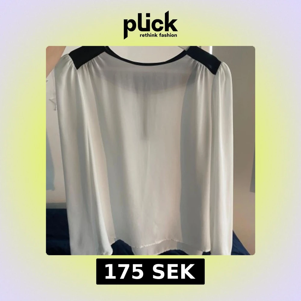 Säljer en stilren vit blus med svarta detaljer vid axlar, halsringning och ärmslut. Blusen har lång ärm och en snygg guldig dragkedja bak. Tunt, lätt material som ger en luftig känsla. Perfekt till jeans eller kjol för en clean look.