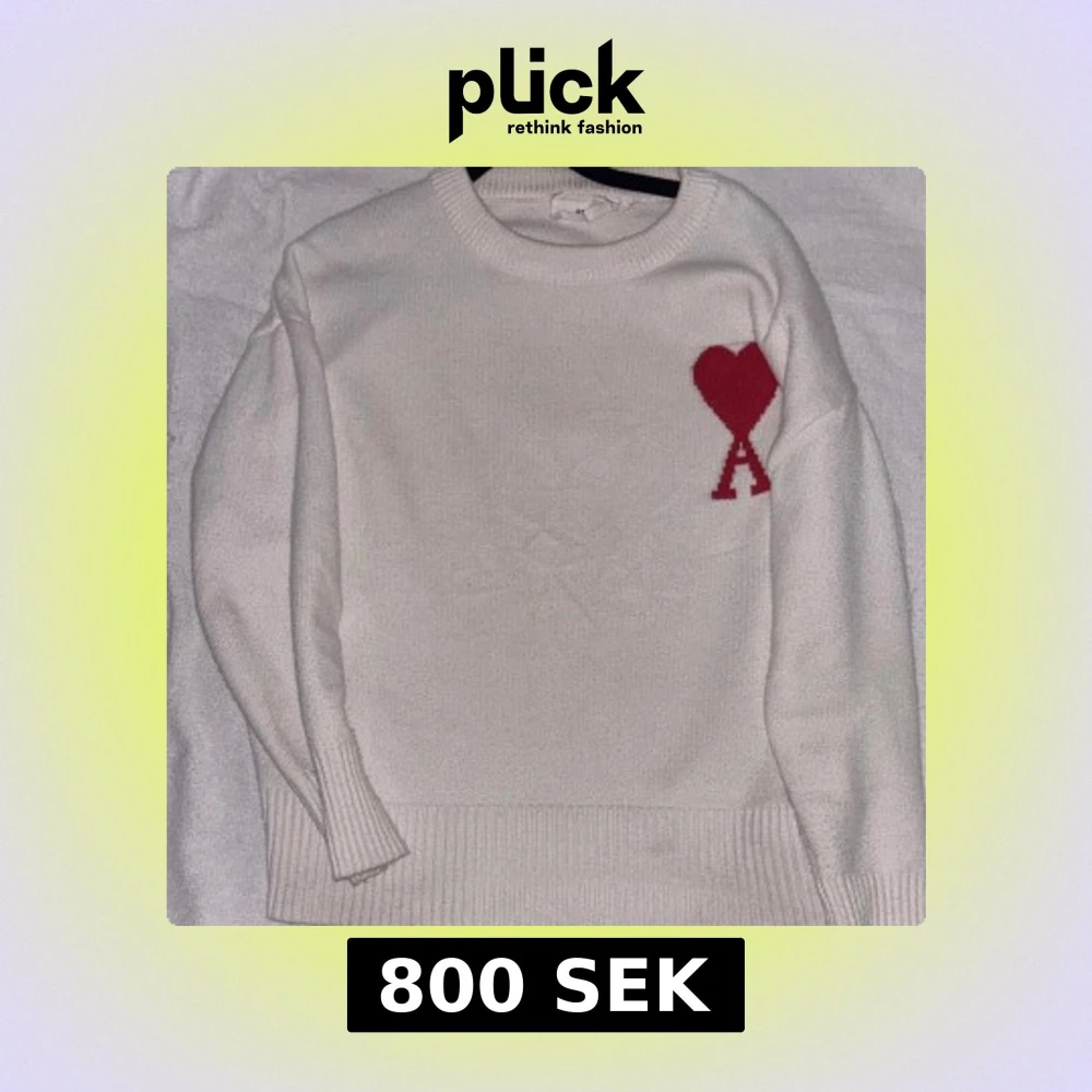 Säljer en stilren vit stickad tröja från Ami med ett rött hjärta och bokstaven 'A' på bröstet. Tröjan har långa ärmar och ribbade kanter vid ärmslut och nederkant. Perfekt för en trendig och bekväm look.