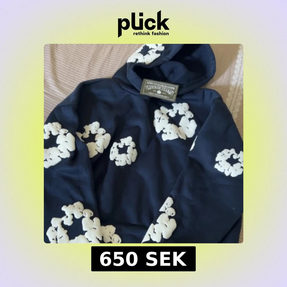 Säljer en mörkblå hoodie från Denim Tears med unikt vitt mönster över hela tröjan. Hoodien har en klassisk passform med långa ärmar och en bekväm huva. Perfekt för en avslappnad stil.