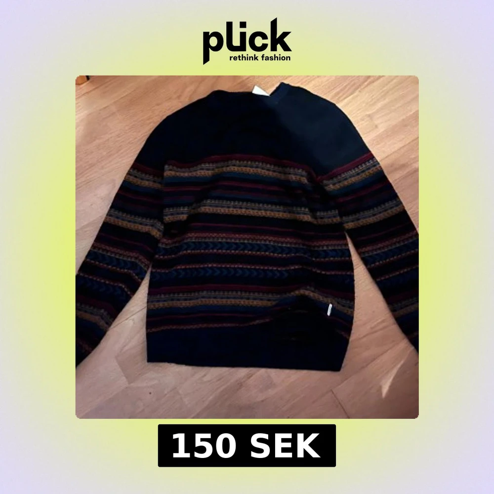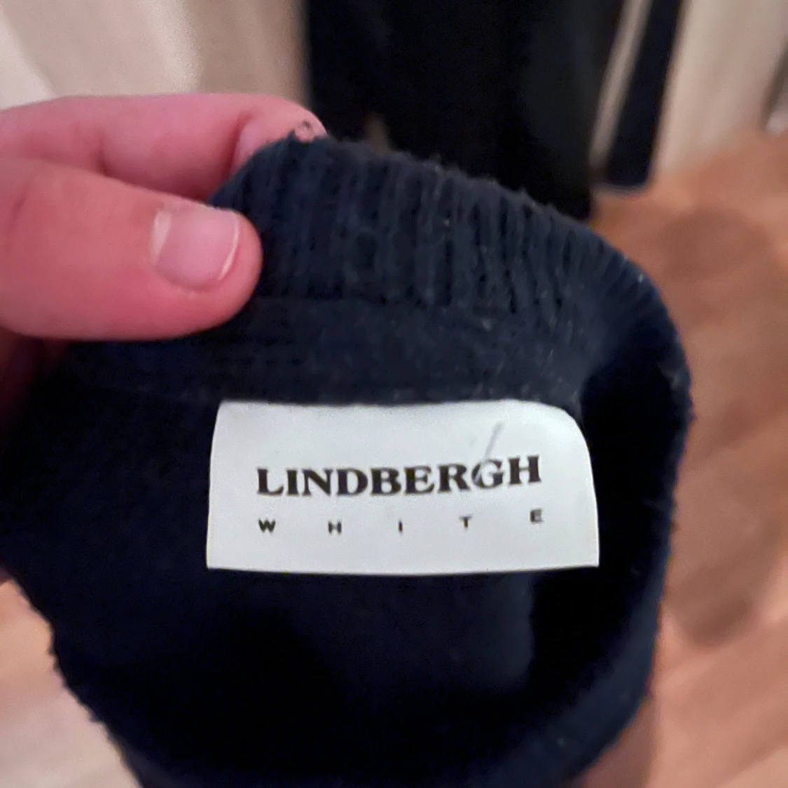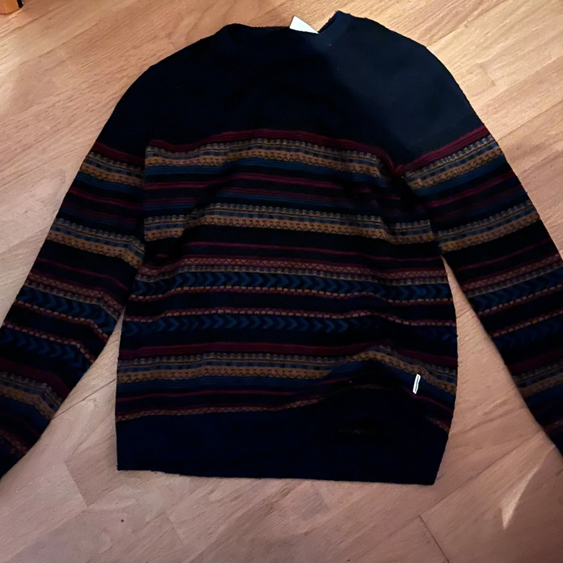 Säljer en snygg stickad tröja från Lindbergh med mörkblå bas och färgglada ränder i rött, gult och blått. Tröjan har lång ärm och ett coolt mönster som ger den en unik vibe. Perfekt för dig som gillar stilrena men ändå lite utstickande plagg.