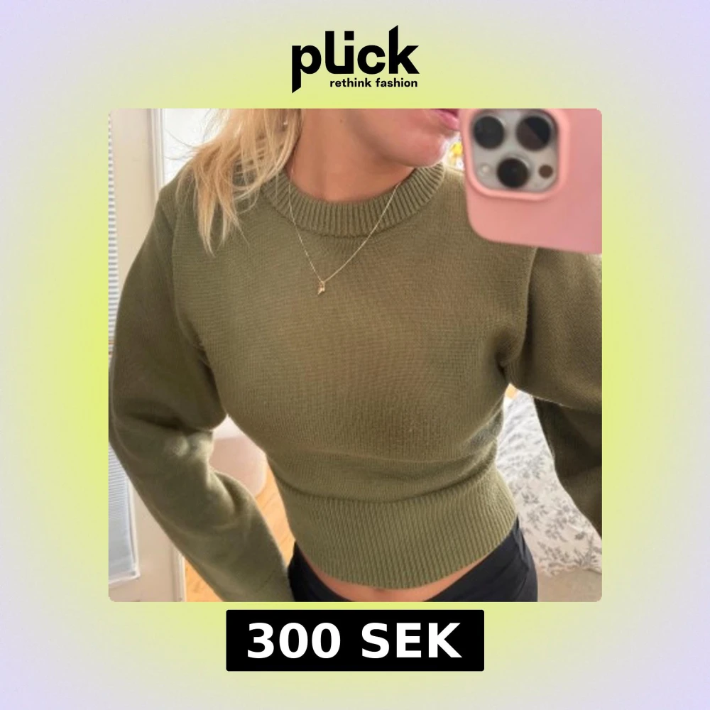 Säljer en olivgrön croppad stickad tröja med breda ribbade muddar vid ärmslut och midja från Zara. Tröjan har rund halsringning och långa ärmar med en loose fit.