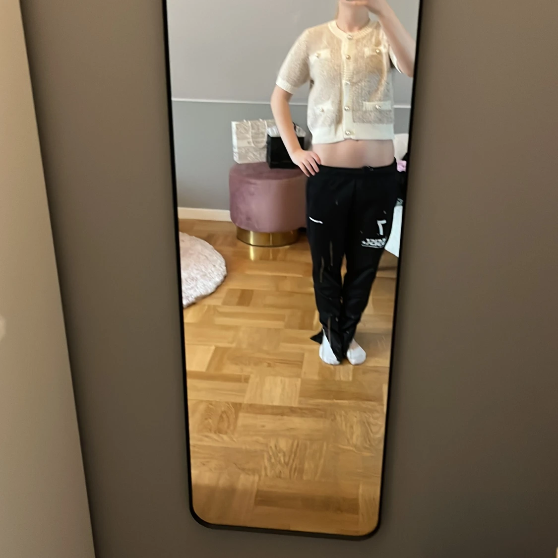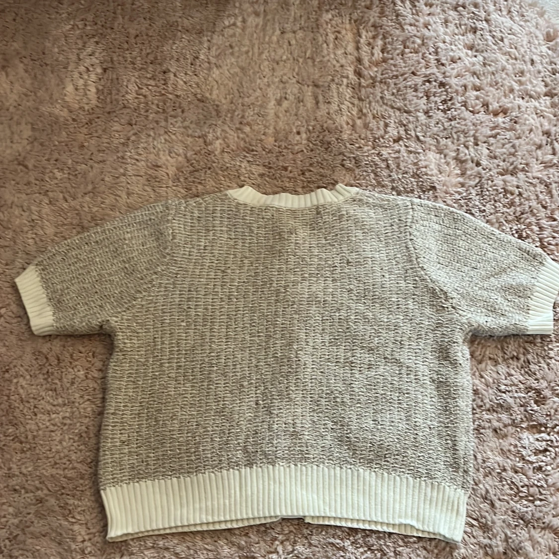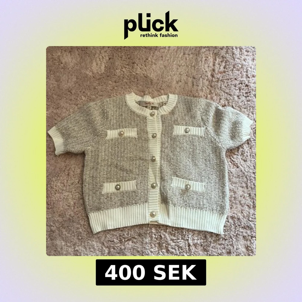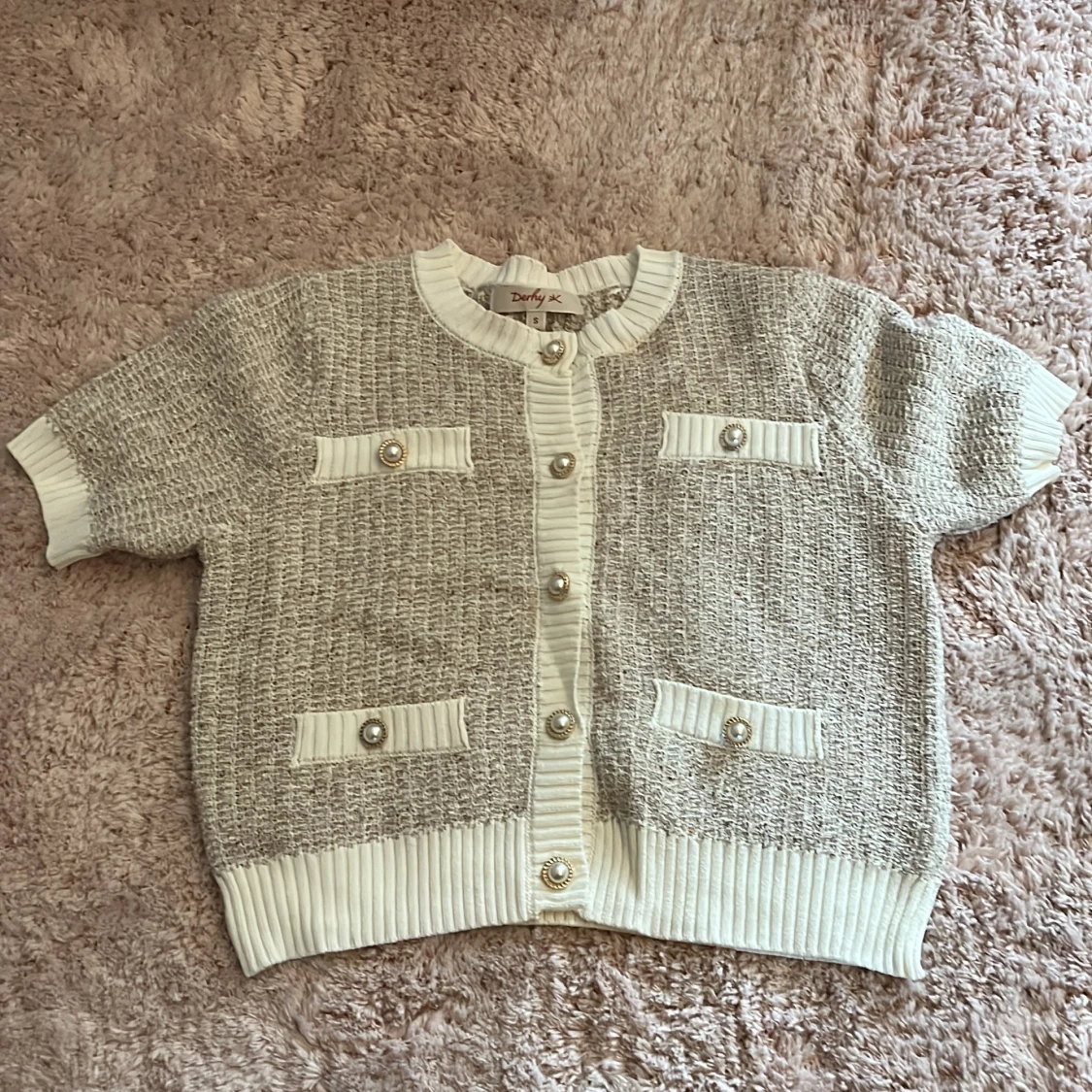 Superfin kortärmad kofta från Derby X i beige och vitt med pärlknappar och dekorativa fickor framtill. Koftan har ribbade kanter och en stickad struktur som ger en lyxig känsla. Perfekt att styla med både jeans och kjol.