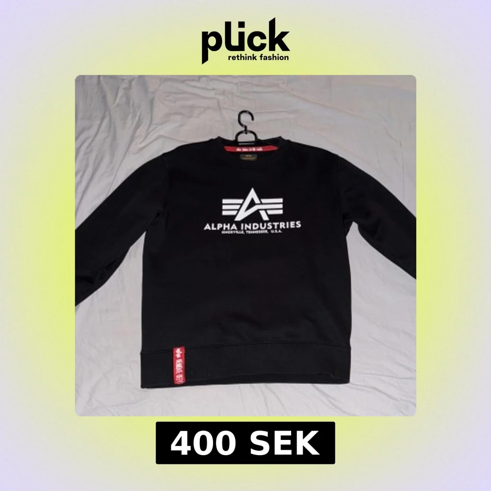 Snygg svart sweatshirt från Alpha Industries med deras ikoniska logga tryckt på framsidan.