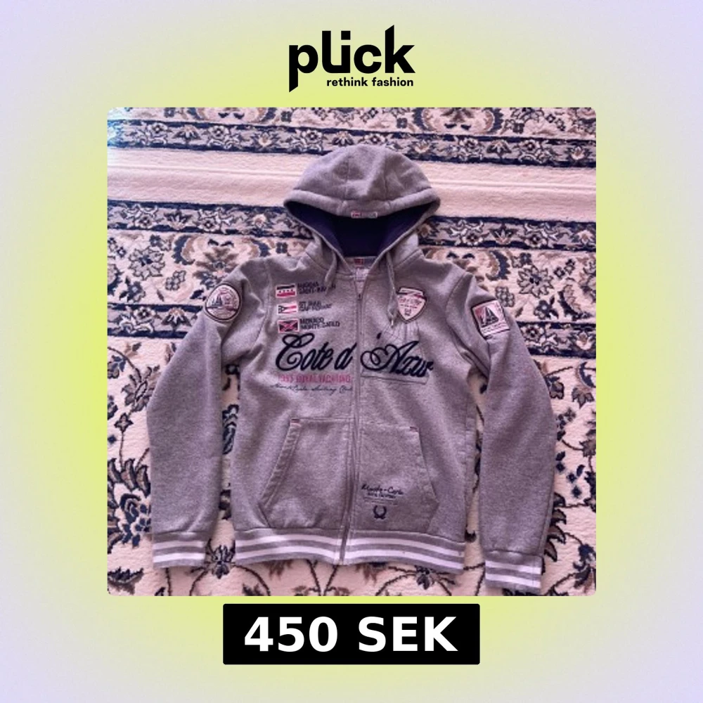 Snygg grå hoodie från Geographical Norway med broderade märken och tryck på bröstet och ärmarna. Tröjan har huva med snörning, dragkedja framtill och två fickor. Ribbstickade muddar med vita ränder ger en sportig känsla. Perfekt för dig som gillar detaljer och marina vibbar.