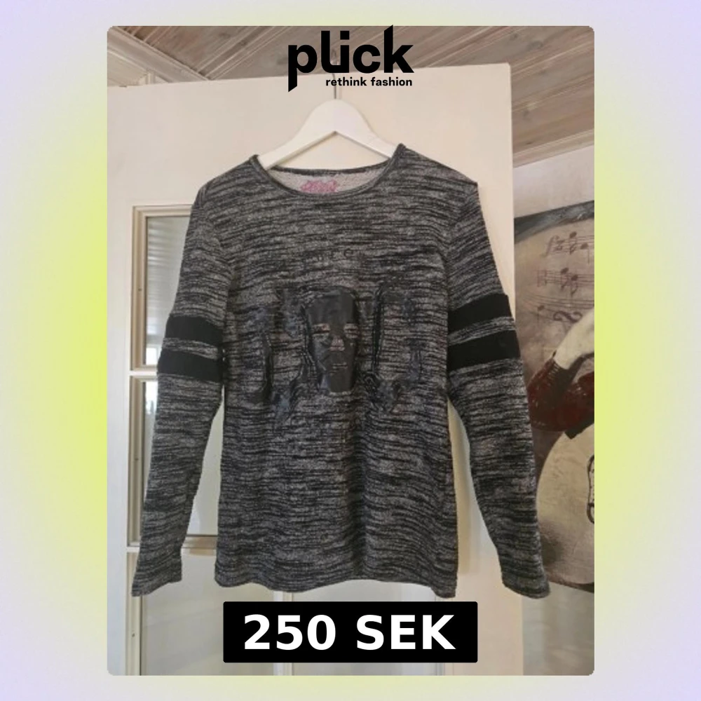 Cool långärmad tröja i gråmelerat tyg med svart döskalletryck framtill och svarta detaljer på ärmarna. Rund halsringning och avslappnad passform. Perfekt för dig som gillar edgy streetstyle.