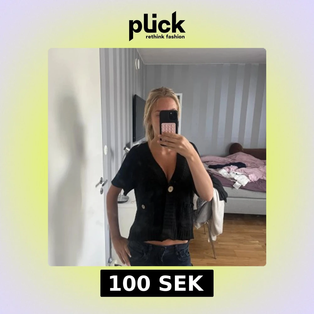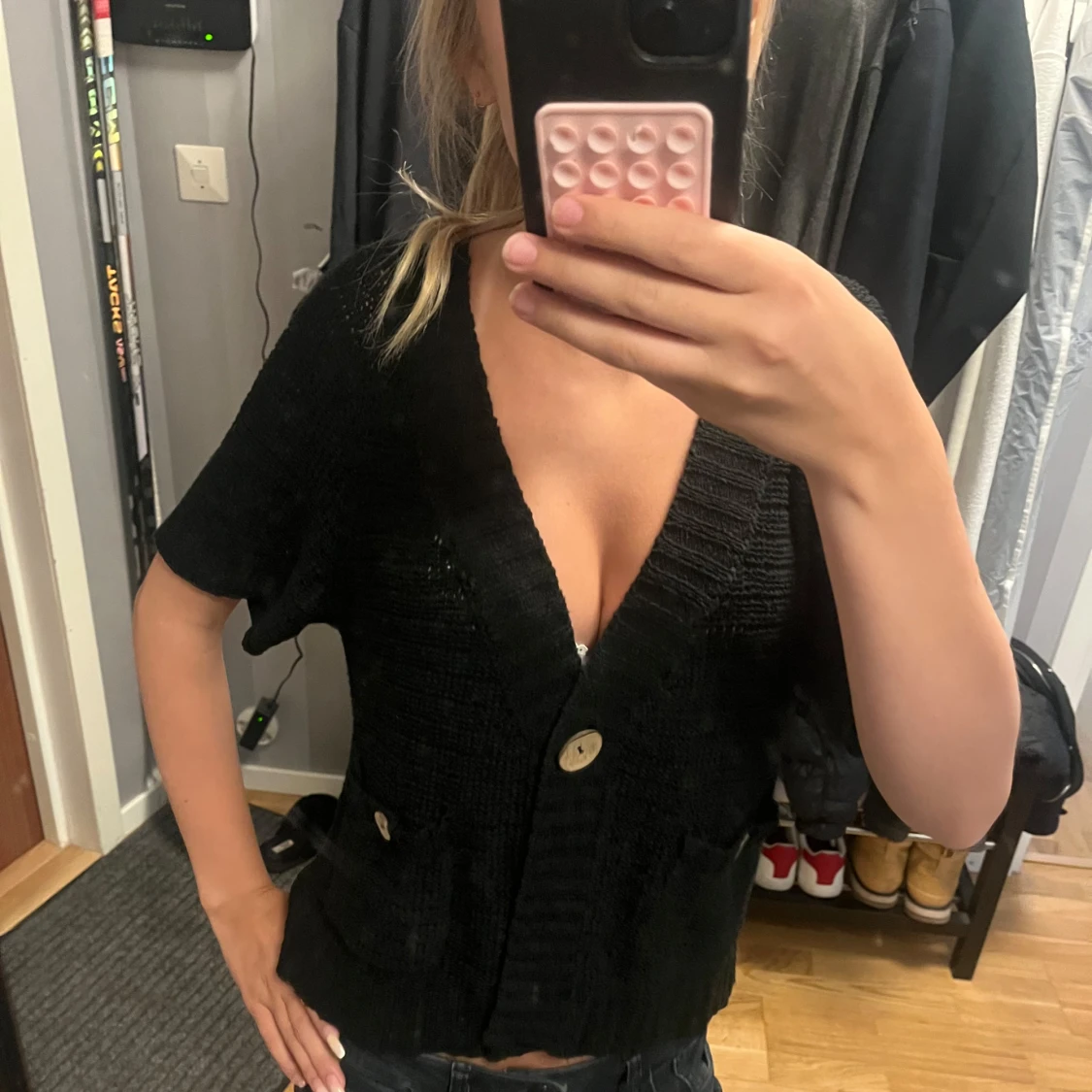 Kortärmad svart stickad kofta med två stora knappar framtill och fickor. Djup v-ringning och croppad passform som ger en chill vibe. Perfekt att slänga över ett linne eller t-shirt för en snygg lager-på-lager-look.