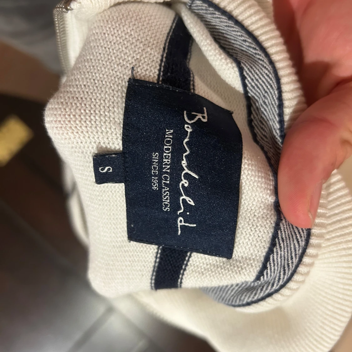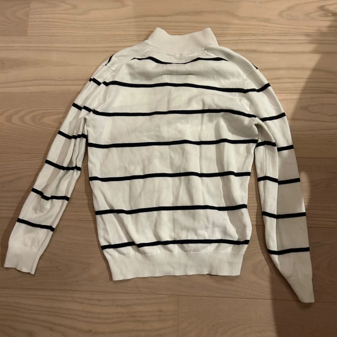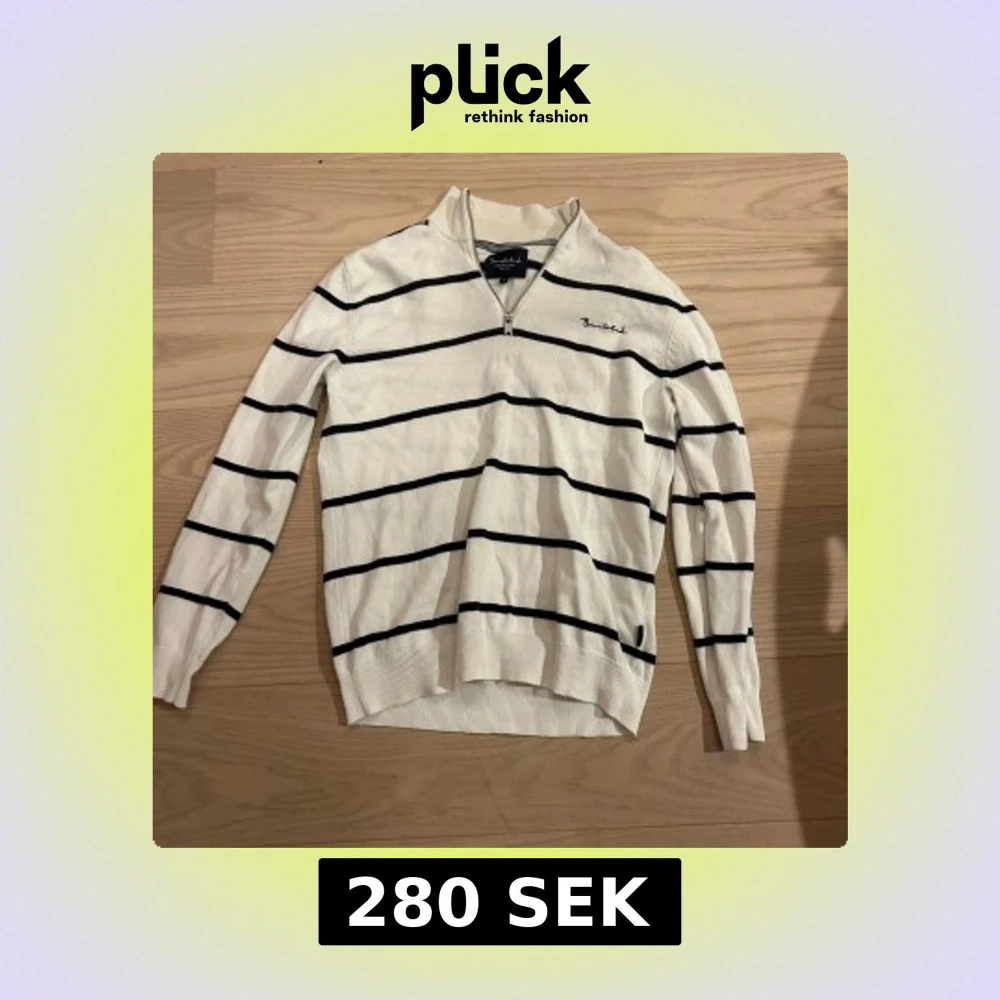 Snygg vit långärmad tröja från MQ med mörkblå horisontella ränder och half zip vid halsen. Tröjan har ribbade muddar och klassisk passform, perfekt för en stilren look. Mjuk och skön, passar till många outfits. Den är väldigt bra skick använt men växte ut.