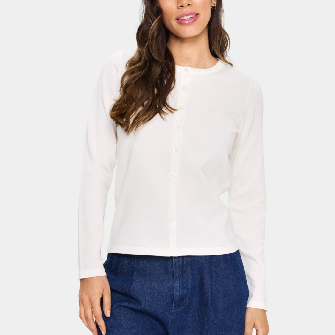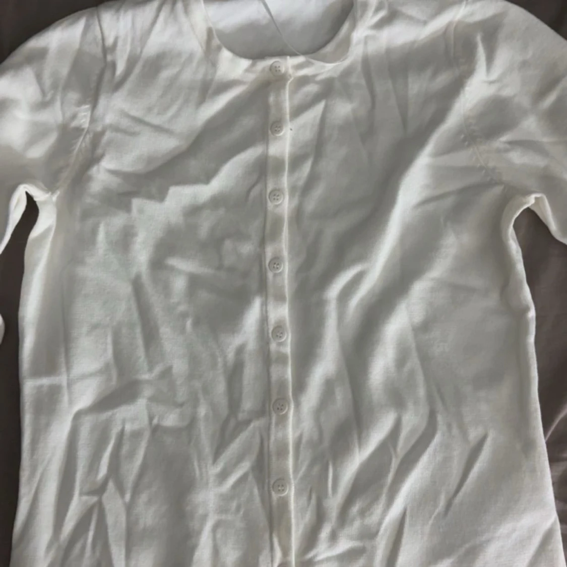 Helt ny aldrig använd. En stilren vit kofta från Laurent tropez med rund halsringning och knäppning framtill. Långärmad och i mjuk bomull, perfekt att slänga över en topp eller bära som den är. Enkel och clean look som passar till det mesta.