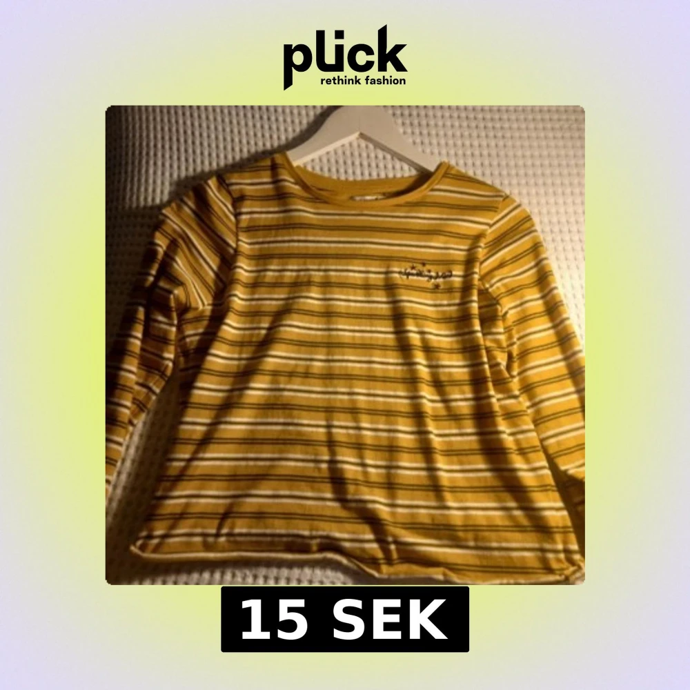 Säljer en gul och vit randig långärmad tröja med rund hals. Tröjan har ett litet broderat motiv på bröstet. Perfekt för en avslappnad stil.