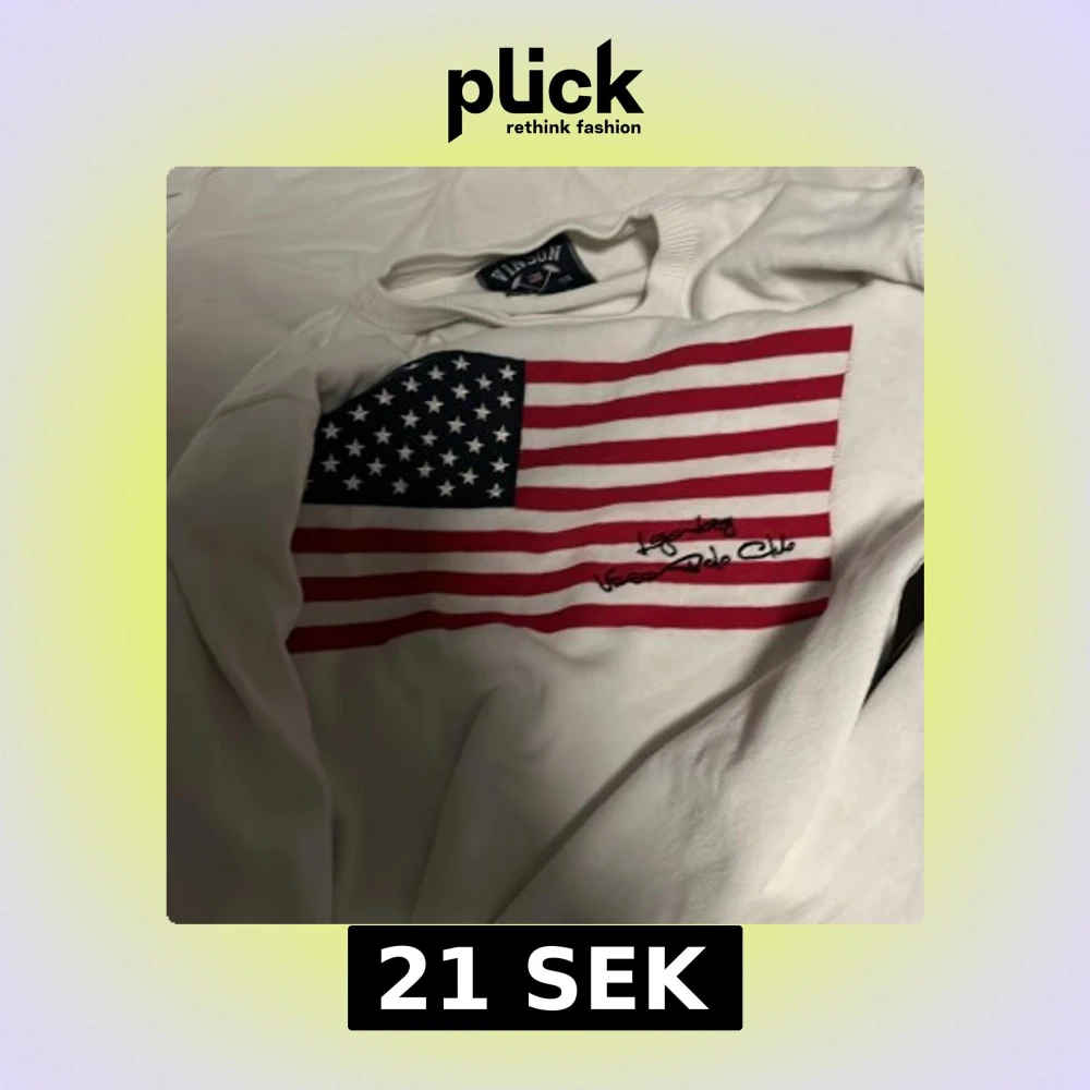Säljer en vit långärmad tröja från Vision med en stor amerikansk flagga tryckt på framsidan. Tröjan har en rund halsringning och är perfekt för en avslappnad stil. Passar bra till jeans eller shorts för en casual look.