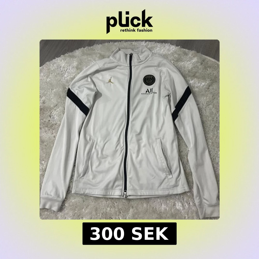 Säljer en äkta vit träningsjacka från Jordan x PSG med svarta detaljer på ärmarna och dragkedja framtill. Jackan har två fickor med dragkedja och klubbmärke på bröstet. Perfekt för fotbollsträning eller sportig stil. Köpt för ett par år sedan men nästan aldrig kommit till användning.