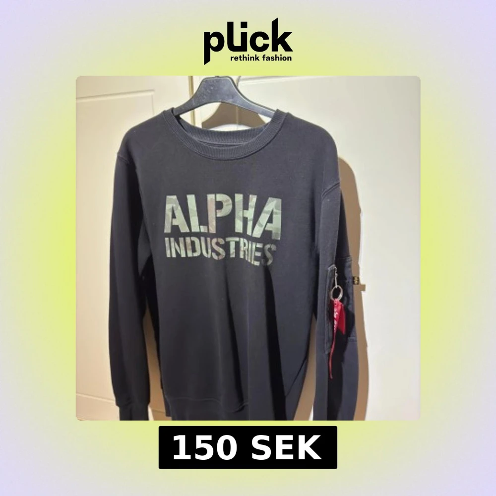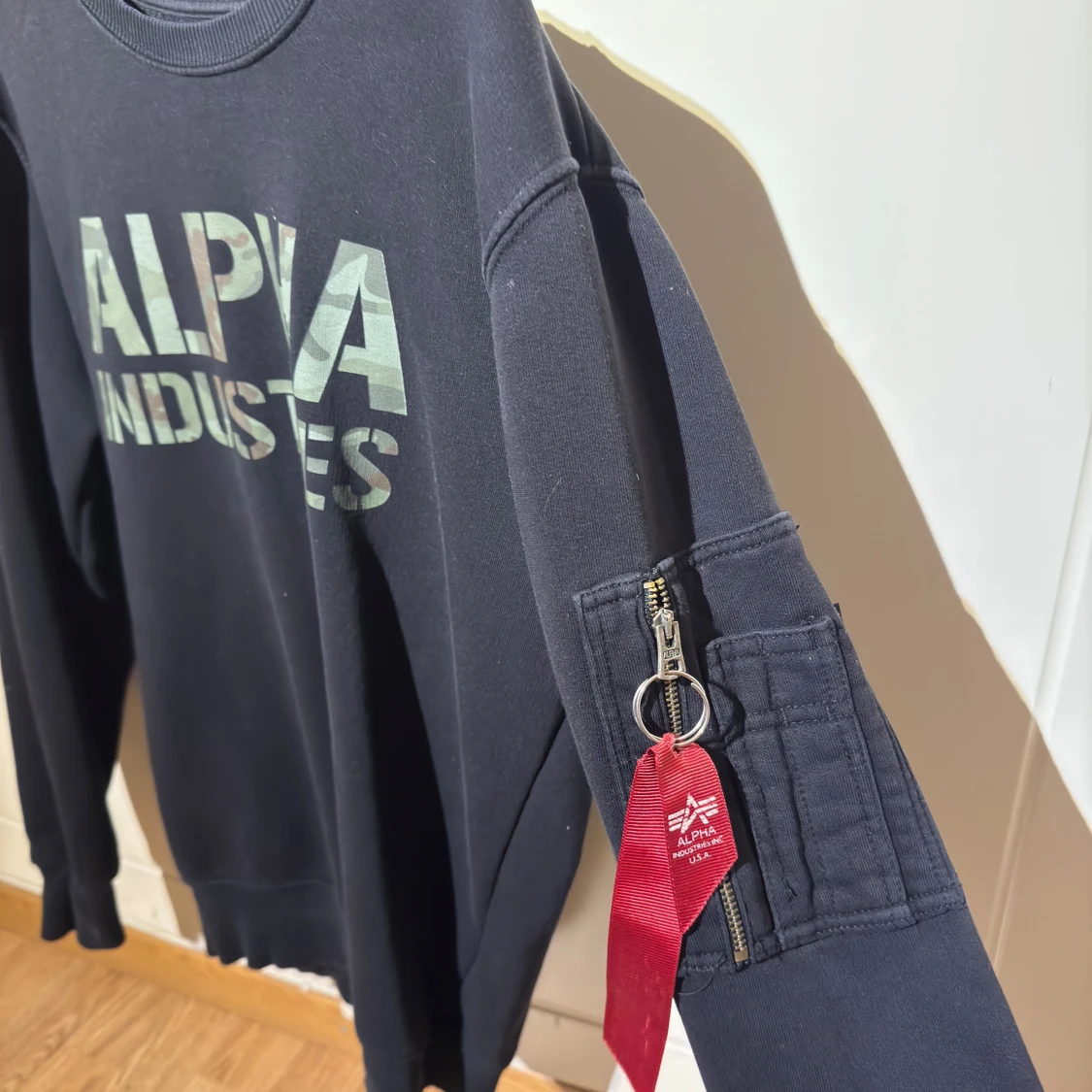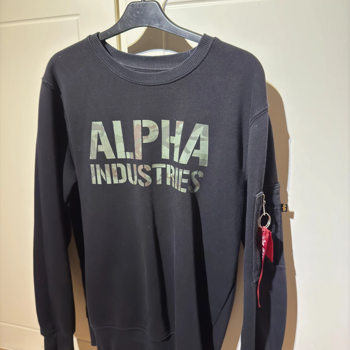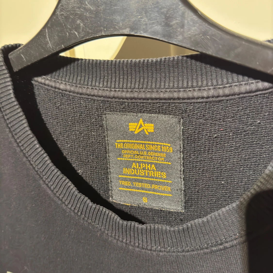 Säljer en svart tröja från Alpha Industries med deras logga i grått på framsidan. Tröjan har långa ärmar och en praktisk ficka med dragkedja på ärmen. Storleken är i S och är i bra skick.