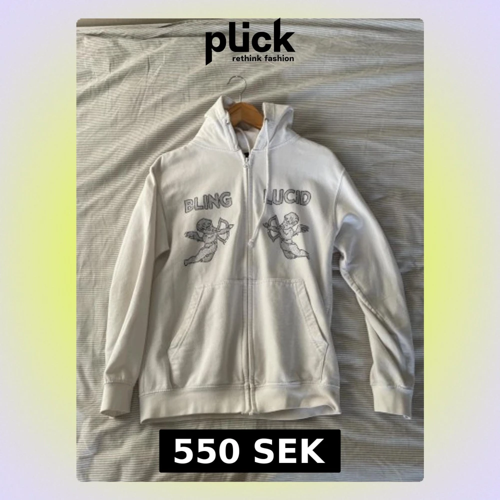 Vit hoodie från Bling Lucid med dragkedja och huva. Framsidan har två svarta änglamotiv och texten 'BLING LUCID' i glittriga stenar. Utrustad med kängurufickor och snörning vid huvan. Perfekt för dig som gillar streetwear med unik design.