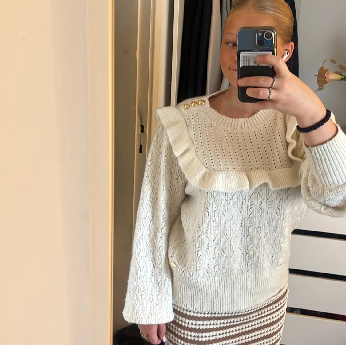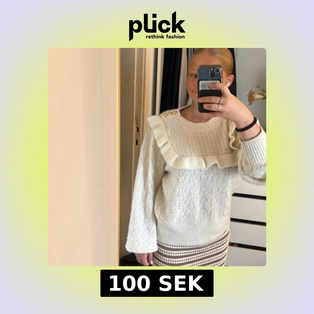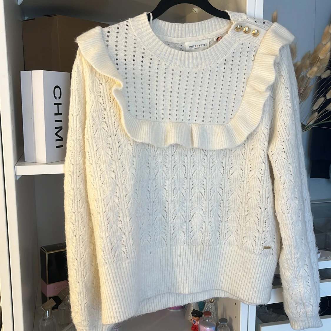 Supersöt vit stickad tröja från Holly & White med volangdetalj över bröstet och axlarna, samt guldknappar på ena axeln. Tröjan har ett hålmönster upptill och bred ribbad mudd nertill och vid ärmslut. Perfekt för dig som gillar romantiska detaljer.