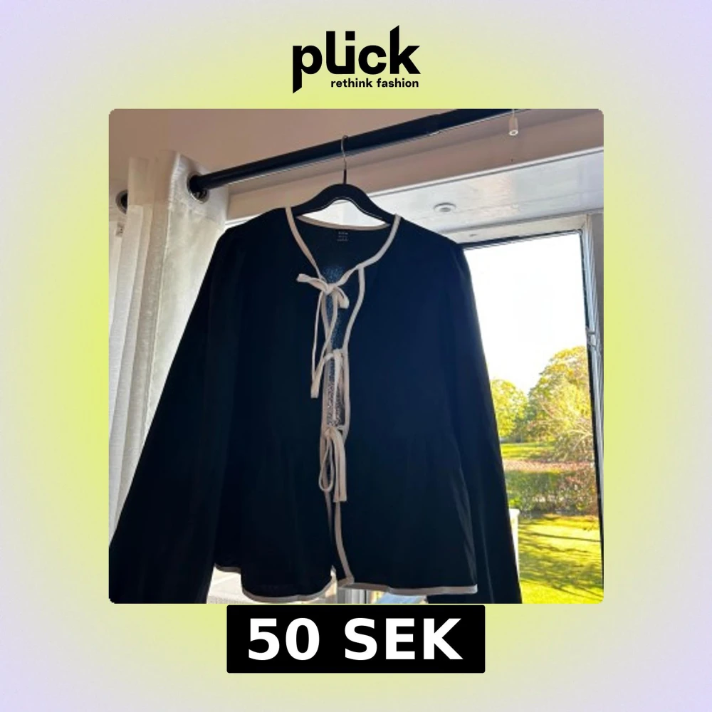 Svart kofta/blus från shein med vita kanter och tre dekorativa knytband framtill. Långärmad och lätt material, perfekt för lager-på-lager. Snygg kontrast mellan svart och vitt, ger en stilren och trendig look.