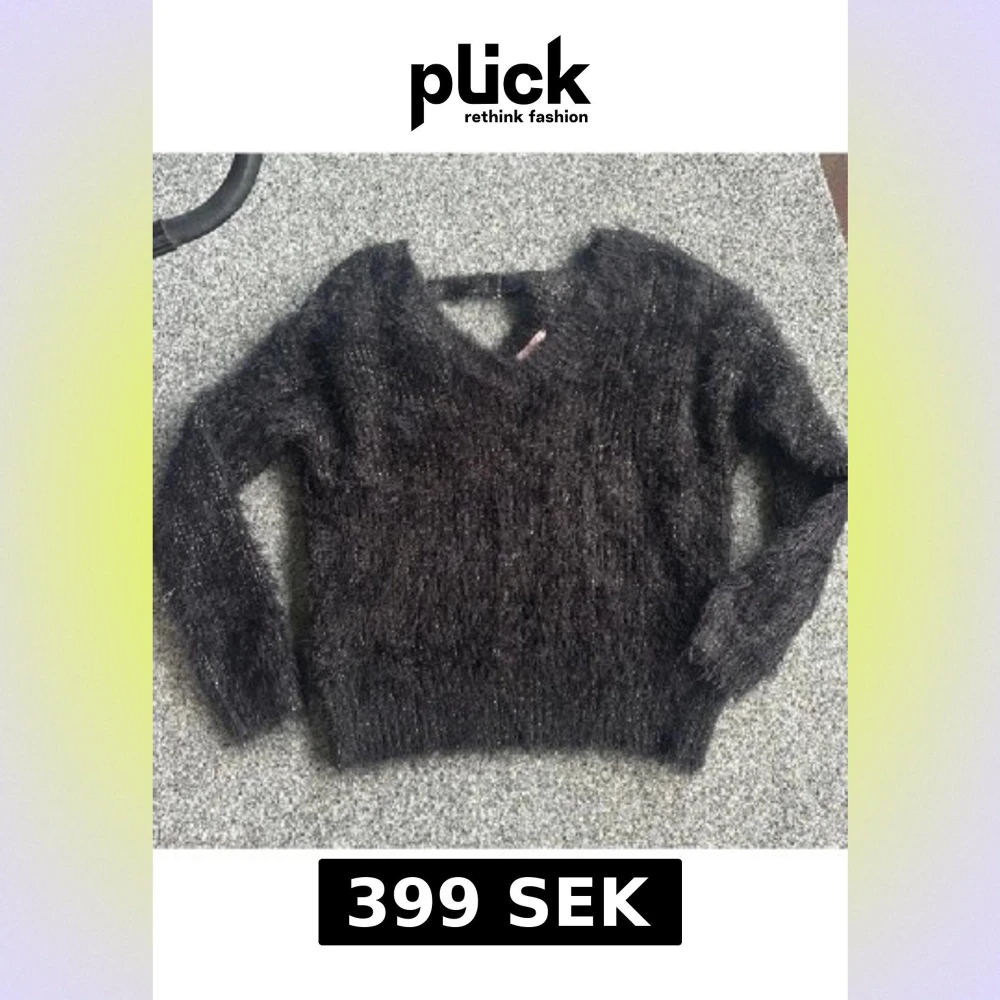 Mysig svart stickad tröja från Sincerely Loved i storlek S. Tröjan har en fluffig textur med glittriga inslag, v-ringad hals och långa ärmar. Perfekt för dig som gillar en lite loose och comfy stil med extra glans.