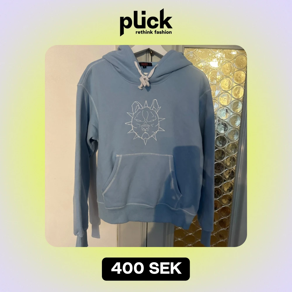 Säljer en ljusblå hoodie från Seams i storlek S. känguruficka och huva med vita snören.
