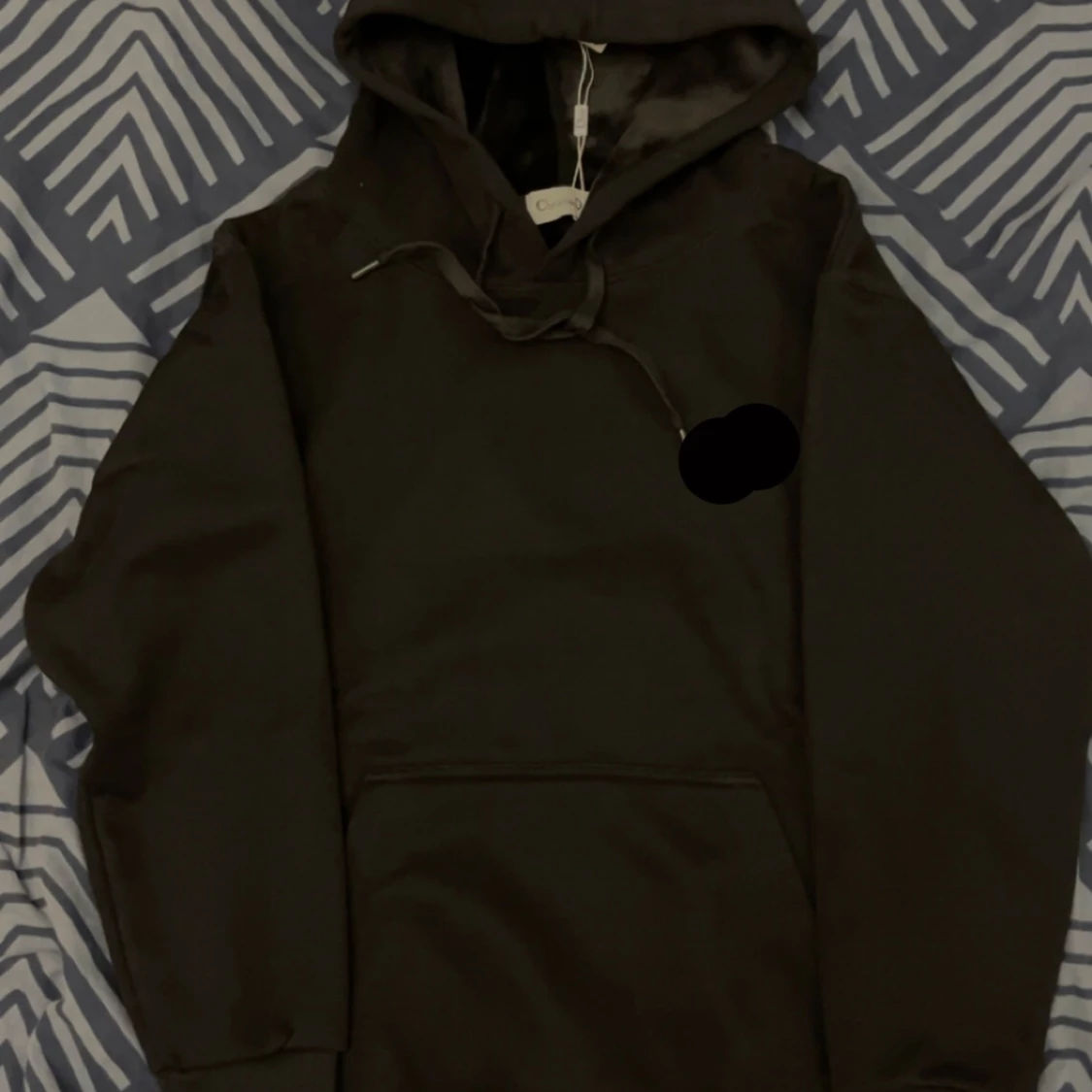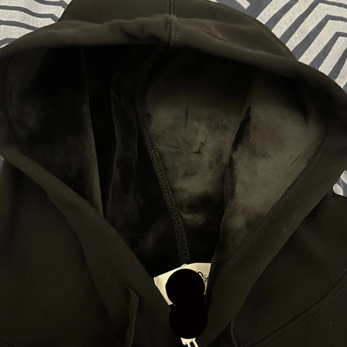 Svart hoodie med mjukt fleecefoder i huvan, perfekt för kyliga dagar. Tröjan har snörning vid huvan och en stor magficka framtill. Stilren och enkel design som funkar till många olika looks. Snyggt och bekvämt plagg för dig som gillar streetwear. Skriv vid frågor om märke!!!