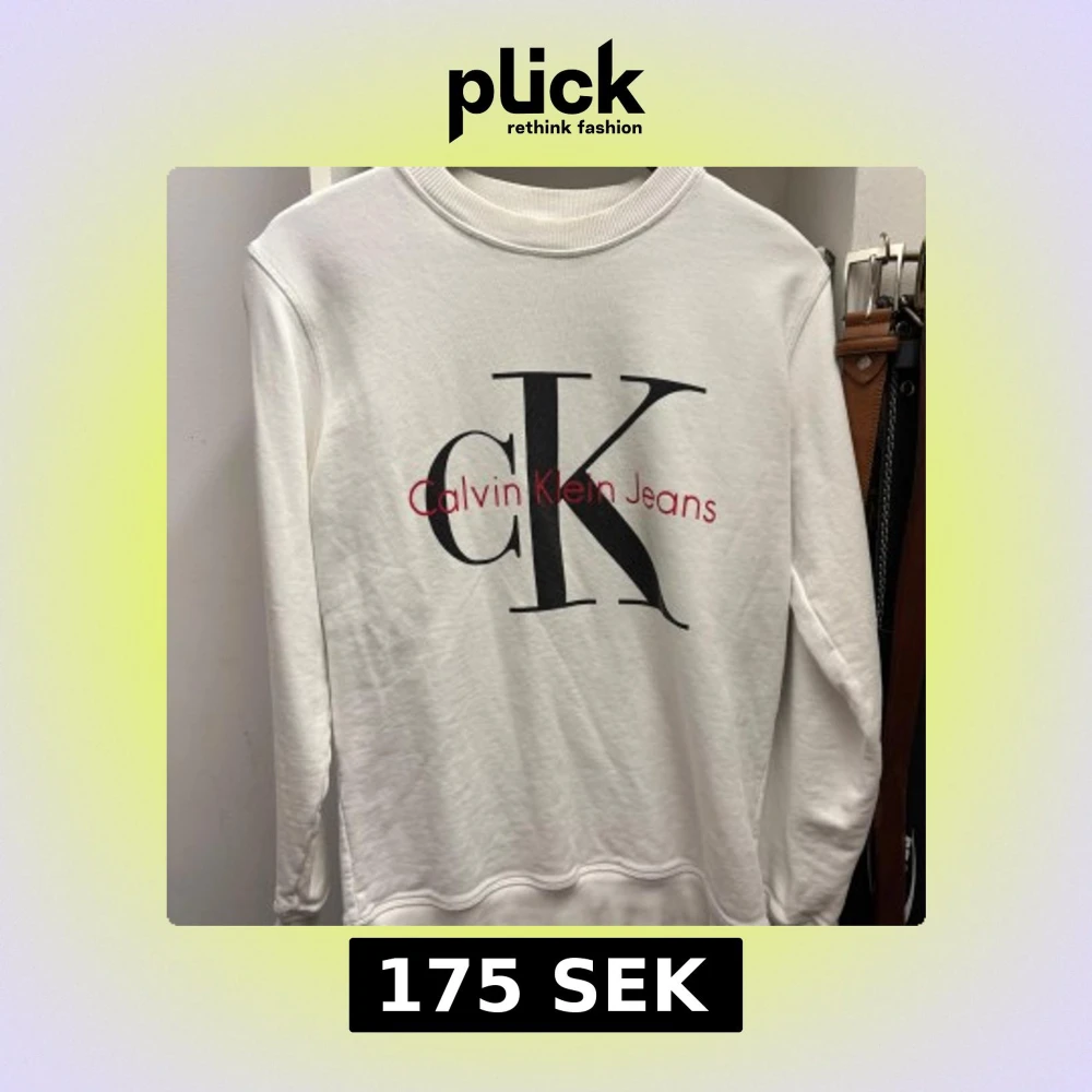 Säljer en stilren vit tröja från Calvin Klein Jeans med deras ikoniska logga i svart och rött på framsidan. Tröjan har långa ärmar och en rund halsringning. Perfekt för en casual look!