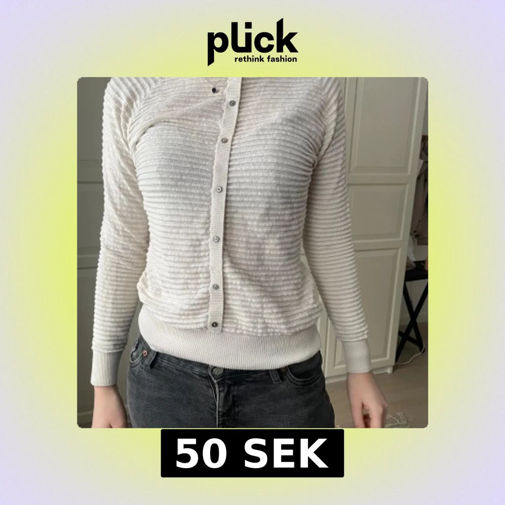 Säljer en stilren vit kofta med ribbad struktur och låtsas knappar framtill (dock har de tappat lite färg men inget man märker av tydligt)