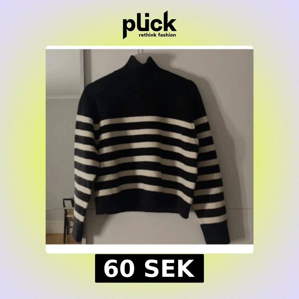 Säljer en snygg svart och vit randig polotröja med långa ärmar. Tröjan har en hög krage och är perfekt för kyligare dagar. Den är både stilren och bekväm. Oanvänd