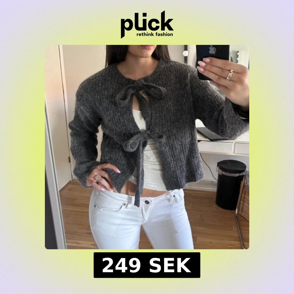 Säljer en mysig grå kofta med grovstickad känsla och två stora knytband framtill. Koftan har lång ärm och en loose passform som ger en chill vibe. Perfekt att slänga över en topp för extra lager och stil. Från gina tricot