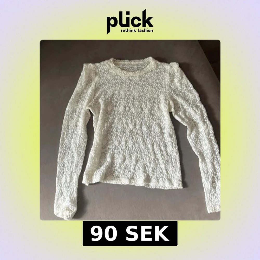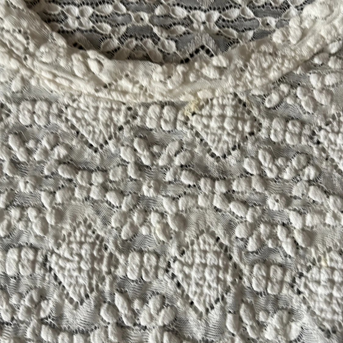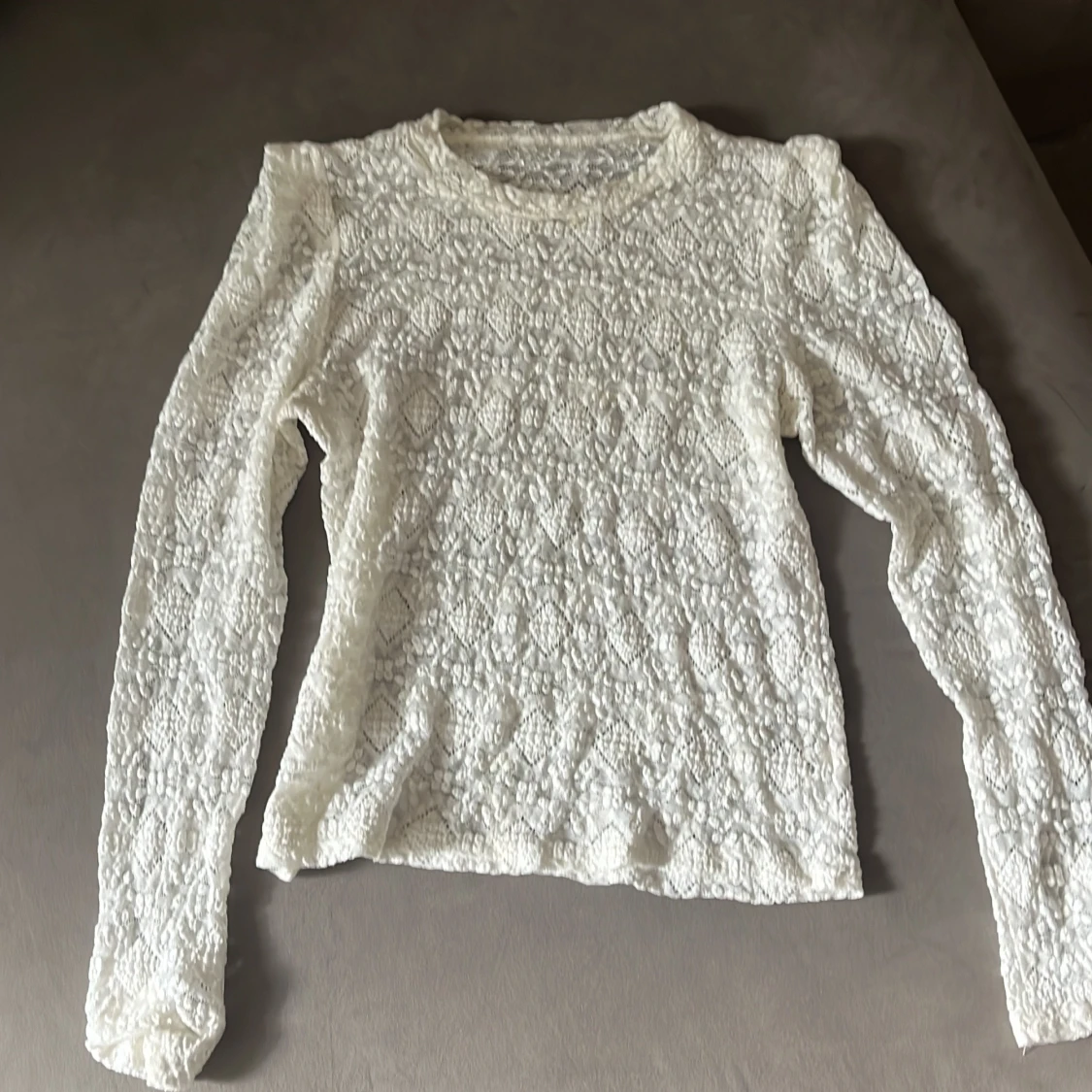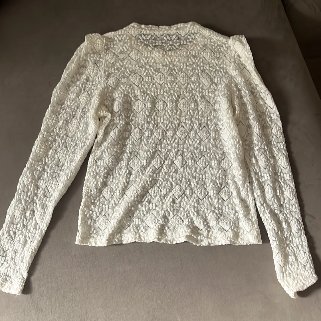 Säljer en vit blus med lång ärm i spets och broderad struktur. Blusen har ett detaljerat mönster med blommor och geometriska former, rund hals och transparenta partier. Perfekt för dig som gillar romantisk och feminin stil.
