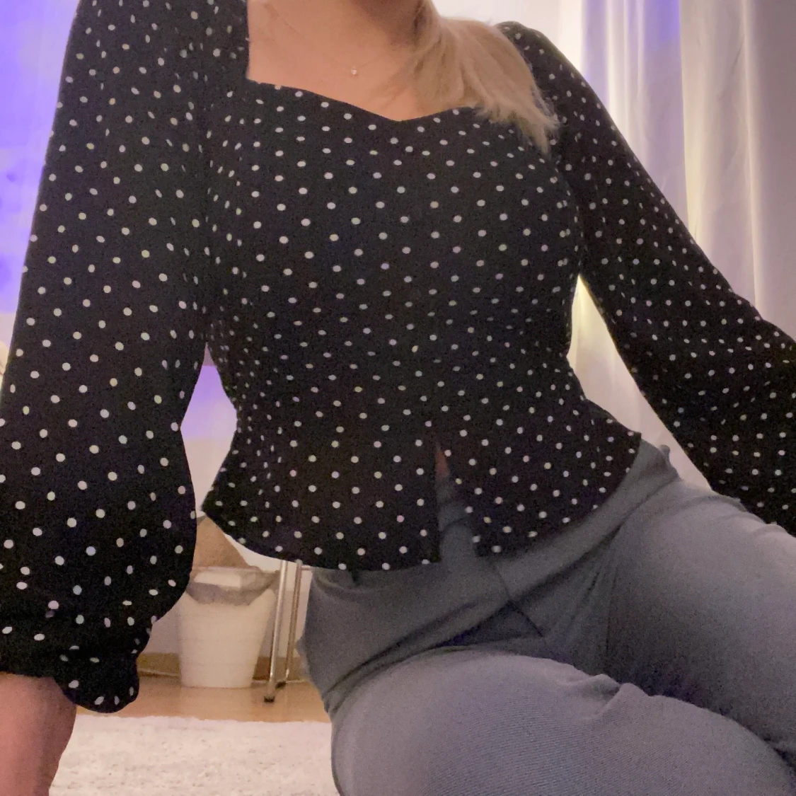Svart tröja med vita prickar, det är små knappar på framsidan, stretchig, framhäver bysten, nyskick❤️